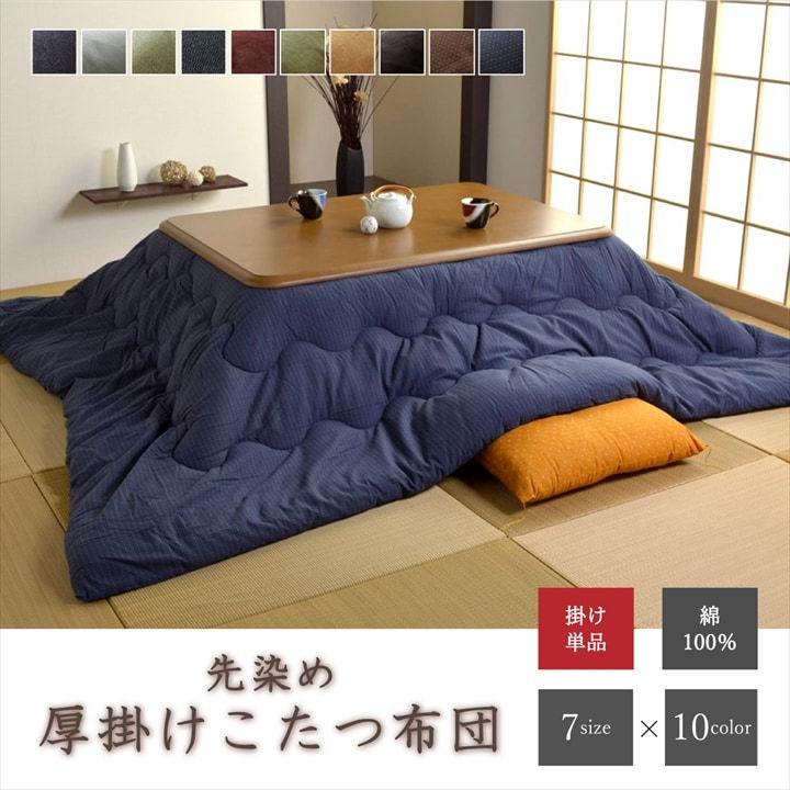 サイズ 約205×315cm (キルティング加工許容範囲 +5%-3%)適応こたつ台サイズ 約80?90×135?180cmのこたつ台に適応カラー デニム:ネイビー/グレイ/カーキ/ブラックつむぎ:ブラウン/グリーン/ベージュ /ブラック刺し子:ブラウン/ネイビー組成 表地=綿100%裏地=ポリエステル100%【ピーチスキン】中材=中空ポリエルテル綿100% 3.2kg原産国 中国製洗濯表示 液温は40℃を限度とし、手洗いができる。(洗濯機は使用できません)干し方=日陰のつり干しがよい。■ 大人気「先染めこたつ」シリーズ!■ 豊富な柄、サイズで大人気のこたつ布団シリーズのこたつ掛け布団です。■ 表地は、綿100%の先染め生地を使用しております。■ 裏地と表地の色味を合わせて更に重厚感あふれる雰囲気に仕上がりました。■ 中綿の量も手を抜かず、しっかりと詰め込みふっくらとした仕上がりになるようにこだわりました。綿ズレを防止するためのキルティングも施されておりますので、使い心地も抜群です。※ こたつ台、こたつ敷き布団は別売りです。※ 本商品は圧縮梱包でのお届けとなります。商品開封後は一切返品を承ることができませんので、あらかじめご了承ください。"}