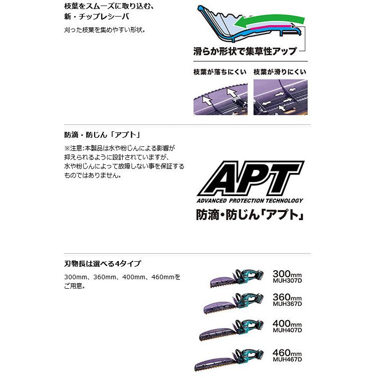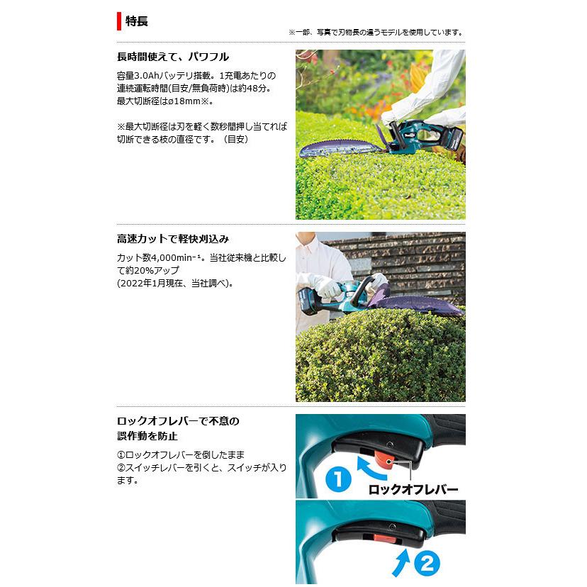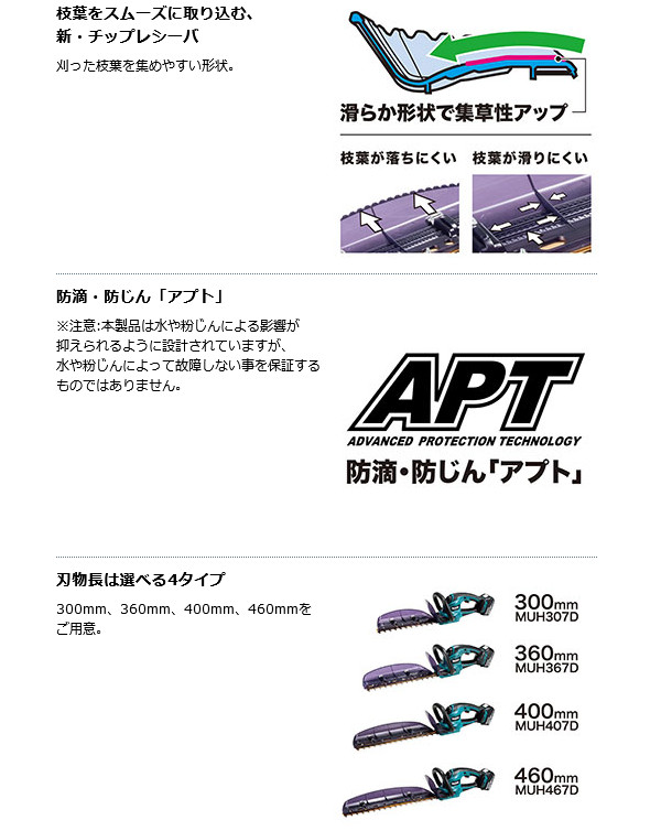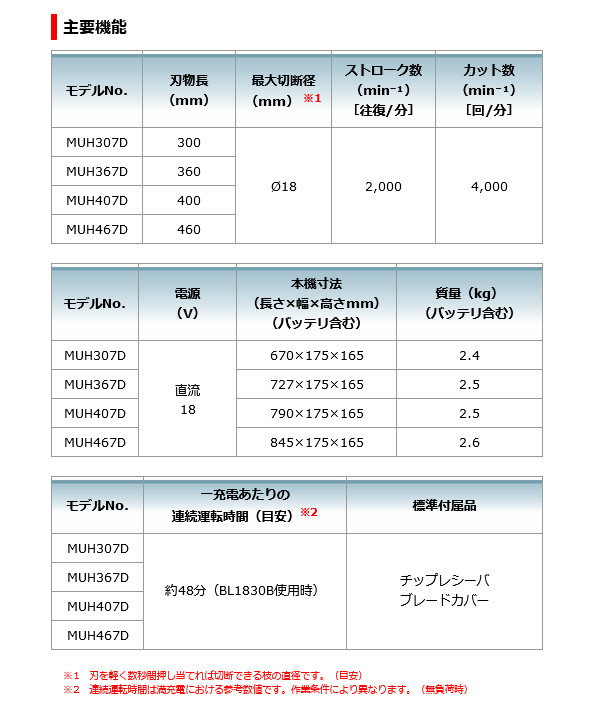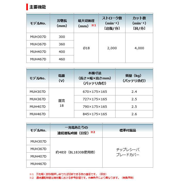 マキタ MUH307DZ 充電式ヘッジトリマ 300mm 18V 本体のみ(バッテリ・充電器別売)・本機寸法(長さ×幅×高さmm) : 670×175×165(バッテリ含む)・質量(kg) : 2.4(バッテリ含む)・電源(V) : 直流 18・刃物長(mm) : 300・最大切断径(mm) : 18・ストローク数(min-1)[往復/分] : 2,000・カット数(min-1)[回/分] : 4,000・標準付属品 : チップレシーバ ブレードカバー