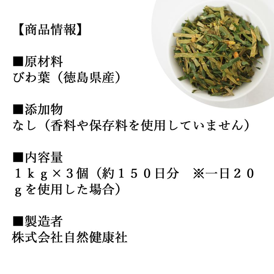【品名】乾燥びわ葉【原材料】びわ葉(徳島県産)【内容量】1kg×3個(約150日分。一日に20gを使用した場合)■枇杷葉(びわ葉)についてびわは温暖な地域で広く栽培される果物で果実は季節のフルーツとして人気ですびわの葉は漢方にも使用され、多くの関連書籍にも記述使い方は様々で枇杷の葉茶に加工されるほかびわ葉エキス、枇杷葉温圧療法、温灸のもぐさ、湿布、サプリメント、スキンケアクリーム、ローション、化粧水など化粧品にも用途があります■商品について徳島県産の無農薬ビワ葉を乾燥させて刻んだもの。無添加100%で製品化健康、美容のドライハーブ、ハーブティー、入浴剤、手作りコスメの材料、原料におすすめ売れ筋ランキングに入ります。業務用にも使える本品をおためしください■使い方そのまま不織布や布袋に入れて、お風呂のリラックスタイムなどにお試しくださいフライパンなどで焙煎して自家製のびわ茶(ビワの葉茶)にも菜食主義(ヴィーガン、ビーガン、ベジタリアン)にもおすすめこども、幼児や妊娠中、授乳中の方でも安心煮出した枇杷茶(びわちゃ)は犬ちゃん猫ちゃんなどペットも安心