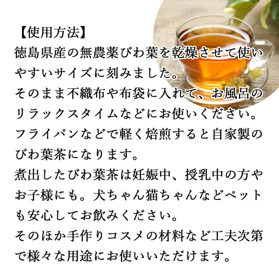 本品は、徳島県産の無農薬ビワ葉を乾燥させ、使いやすく刻んだものです。無添加100%で製品化しました。