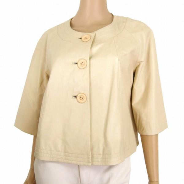 美品/CONCERTINA 極柔レザージャケット 羊革 表記11号(40号/L相当) ベージュ 7分袖 ノーカラー ショート丈 春秋向け アウター レディース