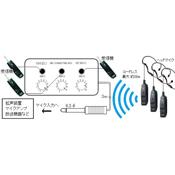ヘッドセット型コードレスマイク3個とマイクミキサーのレンタルセット1泊2日レンタル。前日着でお届けしますので、実質2泊3日となります。3人同時にマイク放送できる無線マイク3本セットのレンタル品です。マイクはヘッドセット型の使い勝手の良いマイクをご用意しました。ダイナミック対応アンプのマイクジャックにマイクミキサーを挿し込み、マイクミキサーには無線マイクの受信器を3本接続してください。到着後すぐ使用できるよう初回の乾電池はサービスでお付けいたします。"} 詳細 ⇒ ヘッドセット型コードレスマイク3個とマイクミキサー(NZ-210CTH2S)詳細 公式サイト